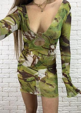 Сукня сітка в зелений принт з колечком на грудях та широким рукавом. Розмір М Стан ідеальний