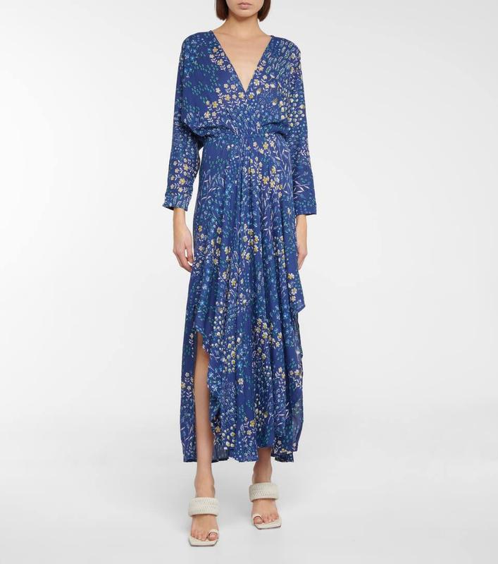 стильное легкое платье миди в цветы состояние идеально размер указан М, смотрите замеры длина в коротком месте 94, в самом длинном 141, рукав реглан 63, грудь свободно за счет кроя летучая мышь, талия 33-40 резинка, бедра свободно