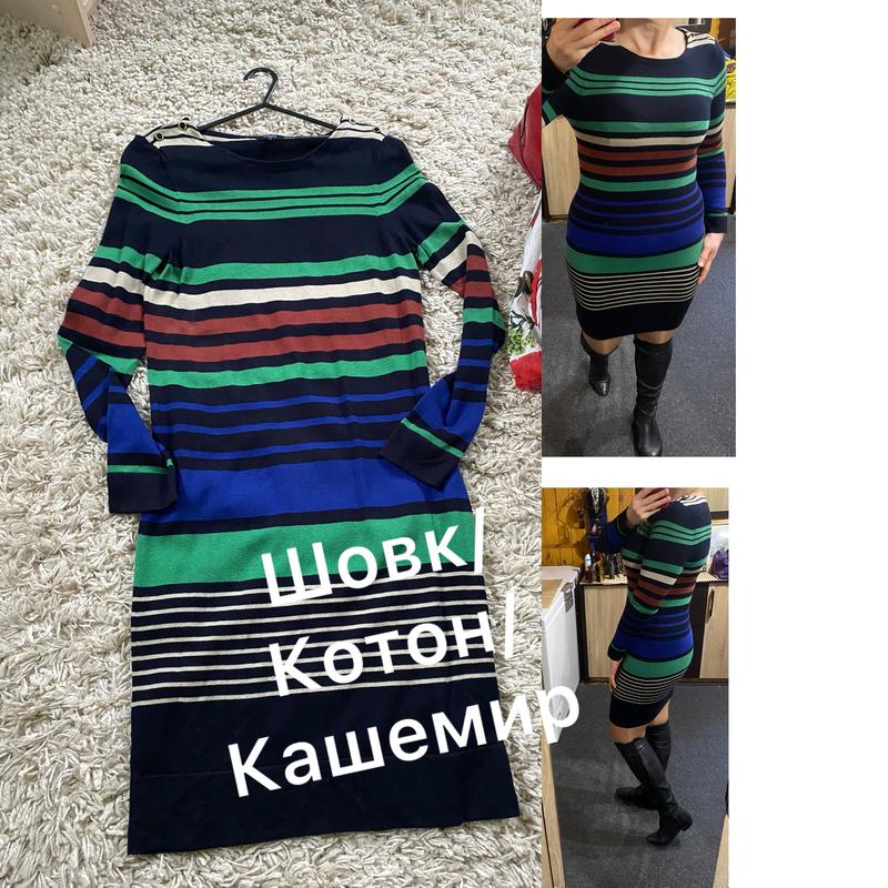 Актуальна вʼязана сукня міді в кольорову смужку з шикарним складом-шовк/котон/кашемир. Стан нової речі Розмір вказано 10,на фото на 12 і зріст 170 Заміри Плечі 40 Рукав67 Пог 45-63 Пот 43+ Поб 45+ Довжина