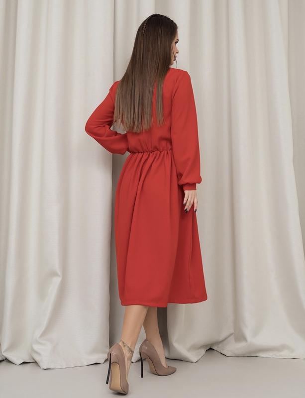 Розміри: 3XL ОГ до 120 ОТ до 110 ОС до 130 Довжина виробу 112 Рукав: 60 Червона сукня класичного крою з гумкою на талії, виготовлена з крепу. Модель з розкльошеним низом міді довжини та довгими рукавами. Модель із бічними кишенями та закритою горловиною на гудзику ззаду.