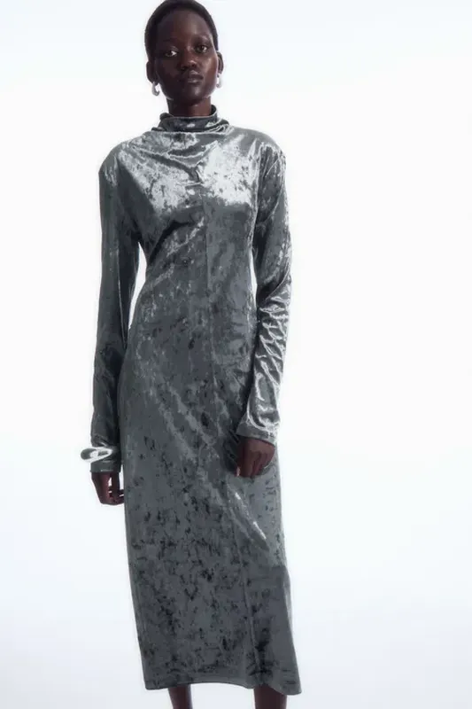 Встретите сезон вечеринок с этим платьем из осенне-зимней коллекции. Платье темно-серого оттенка выполнено из мягкого переработанного бархата с легким эластичным облегающим фигуру эффектом. Высокий воротник создает мягкие складки, подчеркивающие силуэт, а чрезвычайно длинные рукава легко двигаются на манжетах. Соберите волосы, чтобы подчеркнуть открытую спину. 92% переработанный полиэстер, 8% эластан Номер продукту: 1205117002 S CN 165/88А Плечи 46 см Рукав 70 см ПОГ44 см ПОБ 48 см Длина 126 см