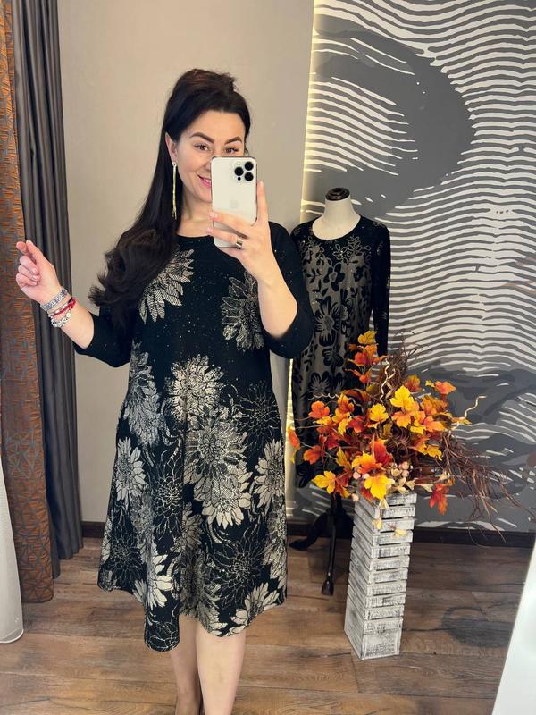 сказочно красивое платье свободного кроя с удобным рукавом 3/4 и длиной ниже колен хорошо смотрится на девушках с фигурами разного типа, скрывая возможные недостатки и подчеркивая достоинства мягкий черный трикотаж с роскошным цветочным принтом и легким блеском красиво ложится на фигуру, платье шикарно подходит для праздника, выхода, работы и повседневной носки, легко сочетается с обувью на низком каблуке и каблуке. Размеры 50, 52, 54, 56, 58 в зависимости от размера длина 102-106 см, объем груди по изделию 112+4 до 128 см хорошо садится на настройки 108-126 см, длина рукава от шеи 52-55 см код L 7083-280