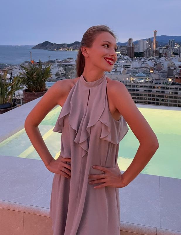 Літня сукня вільного крою. На зріст 175 закінчується до коліна. Дуже гарно відкриває плечі і руки, для дівчат з невеликим бюстом - додасть необхідний обʼєм у грудях. Має підкладку, не просвічує. У разі необхідності приховає нюанси фігури за рахунок вільного крою сукні
