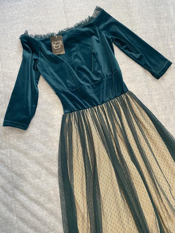 Невероятное бархатное платье изумрудного цвета. Платье с открытыми плечами и рукавчиком 3/4. Фатиновая юбочка делает ее крайне нежной. Размер М. Полуобхват груди 35 см (материал тянется). Полуобхват талии 30 см Плечи 40 см Рукав 3/4 - 40 см Длина 110 см Сукня нова. Не вдягалась. Пересилаю.