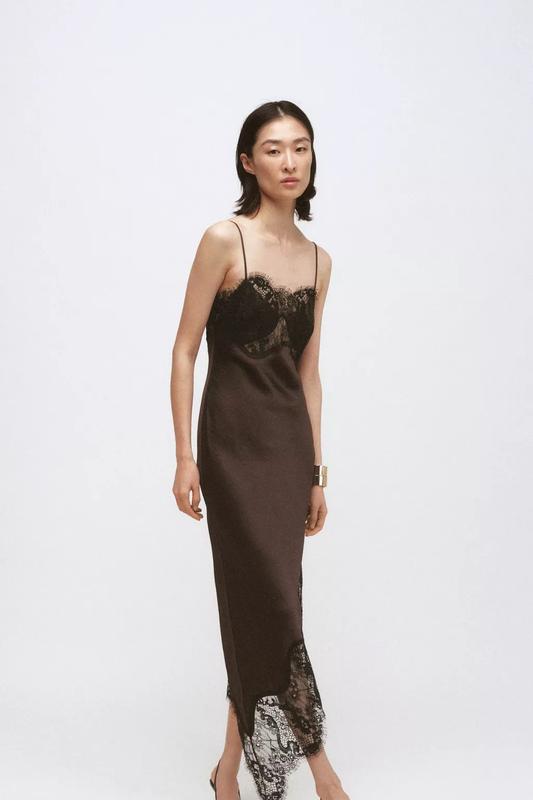 Сукня з круглим вирізом і тонкими бретелями. Контрастна мереживна аплікація. Асиметричний низ. BLACK / BROWN | 4772/113/099