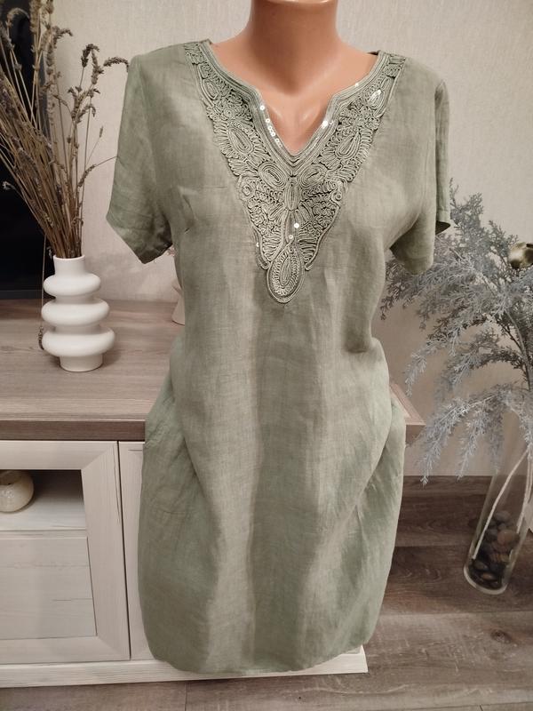Гарний оливковий колір , натуральна тканина, має бокові кишені.Напівобхват грудей 46, стегон 50, довжина 100.