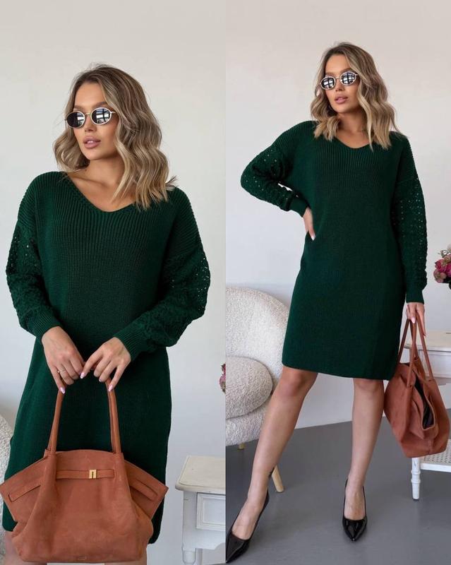 📍ВАЖЛИВО. Заказ писать ✍️см в чат. Оплата 100% на счет ФОП. Есть, обмен, возвращение. 🔥ХИТОВАЯ НОВИНКА🔥 💞Платье машинная вязка. Модель 50М82d ▪️Размер универсальный 44-56 ▪️Состав 50% шерсть, 50% акрил. 💰Цена 890 грн ▪️Цвета: голубой, темная пудра, светлая пудра, сирень, молоко, изумруд 💫✔️ Замеры: - длина 92-95 см; - ширина 52-60 см; - длина рукава от горловины 72 см Вязаное платье комфортного свободного кроя с акцентными ажурными рукавами. Стильный V-образный вырез добавляет женственности, а универсальная длина делает вещь практичной как для повседневного образа, так и для праздничных выходов.