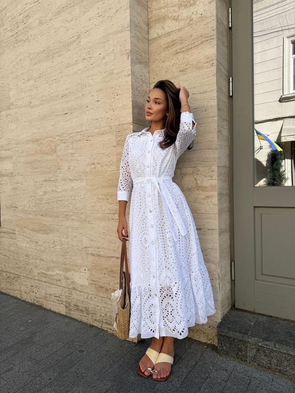 Плаття із 100 % котон прошва з перламутровими ґудзиками має лямки під пояс з двома кишеньками Довжина 112 см Талія 42 см , пол стегна 51 см Пог 46 см Плечі 34 см Рукав 46 см