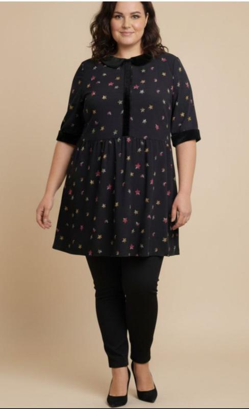Платье туника в идеальном состоянии британского бренда. Красиво смотрится с джинсами, лиггинсами, или отдельно как платье Ткань вискоза, средней плотности, не просвечивается манжеты и воротник бархат Цвет черный с цветными звездами. Застежка спереди на потайные пуговицы в планке Есть нагрудные выставки, по спинке на талии резинка для регулировки ширины Туника бережно выстирана, выглажена, готова к использованию грудь полуширины 59 талия полуширины 49 тянется до 67 бедра свободно длина 91 рукав 35