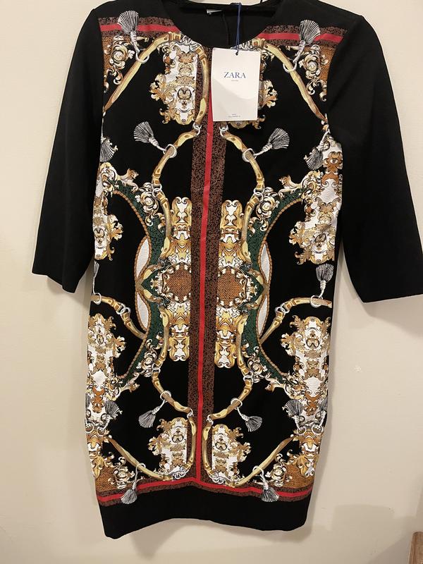 Ця чорна сукня Zara має бароковий візерунок із золотими та зеленими деталями та червоною смугою по центру. Це сукня-футляр з рукавами 3/4, виготовлена переважно з поліестеру з невеликим додаванням еластану. Характеристики продукту Бренд: Zara Стиль: Сукня-футляр (Shift dress) Колір: Чорний з принтом золотого, зеленого та червоного кольорів Матеріал: 97% поліестер, 3% еластан Рукава: 3/4 довжини Деталі: Блискучий прогумований бароковий візерунок, візерунок нагадує золоті ланцюжки