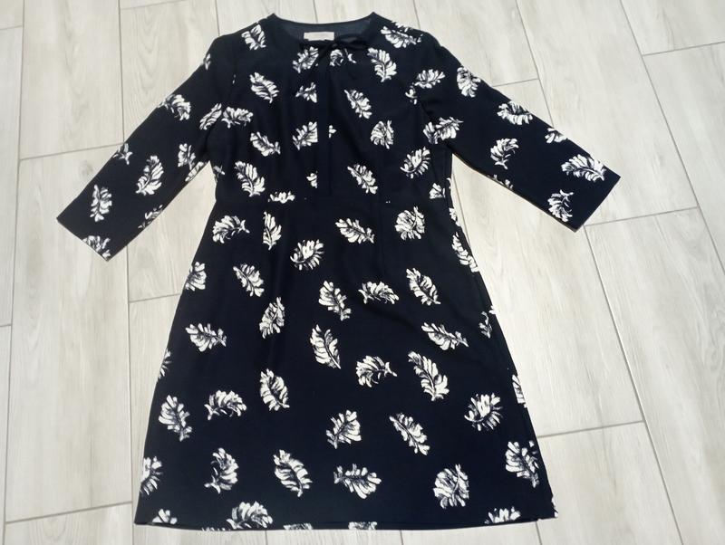 Стильное платье Hobbs с принтом перьев. Размер UK 14 (L/XL). Темно-синий цвет, рукав 3/4, прихожая молния сбоку для удобного одевания.Прямый крой (tunic style), мягко ложится по фигуре. Имеет изящный вырез с завязками на шее и декоративную планку с пуговицами Идеальная для офиса или праздничного события. Новая с этикеткой.
