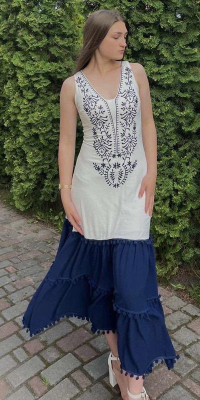 Дуже красива сукня з вишивкою. Оригінальна Туреччина Класна якість. Розмір 38 ПОГ 45 см ПОТ 35 см ПОБ 48 см Довжина 126 см Колір Шампань / блакитний Тканина трохи тягнеться.
