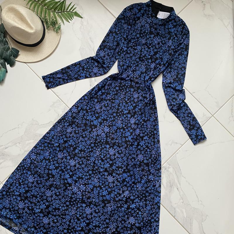 Сукня сіточка в сині квіти стан ідеальний,має підклад, ззаду на замочку, ворот стійка, паперова бірка, гарно тягнеться р 10 с м -довжина 126, рук 61 -нОг 45-50 -нОт 36-44 -нОб 53-59 ФОТО НА ТІЛІ НЕМАЄ