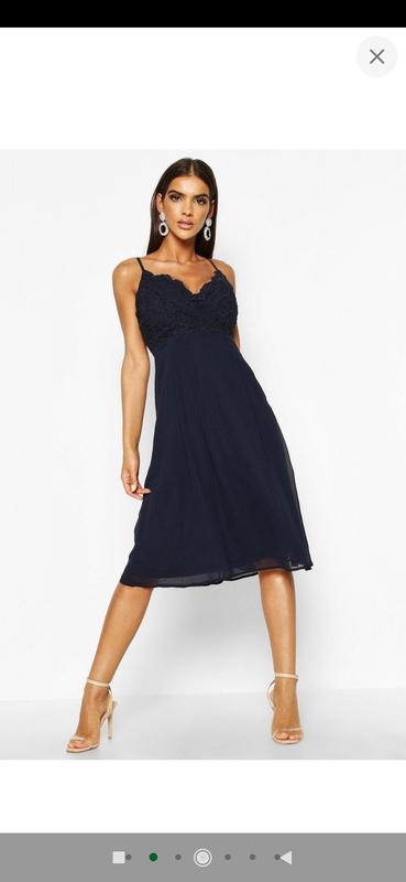 Платье Boohoo (Размер 44/46 (М, UK12)) Цвет темно-синий. С открытым верхом, кружевным лифом, внутрь можно вставить чашечки (в данном платья чашек нет). Застежка на потайную молнию в боковом шве. 100% полиэстер, нижняя юбка трикотажная. Не просвечивает. Размер 46 (М, UK12). Ширина по груди 46 см, тянется в большую сторону за счет резинки на спине. Ширина на уровне талии 38 см. Длина от верхнего уровня лифа 108 см. Бретели регулируются.