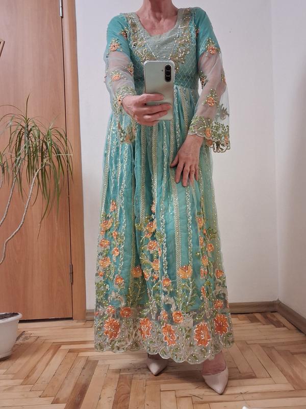 Изумительное платье на подкладке. Шикарная вышивка. Верх платья сетка. Красивый цвет, бирюза. Платье идет с шалью. Стан очень красиво Размер смотрите по замерам Пог-48, Пот-30-40, плечи-36, длина-135, от плеча до талии-37 см.