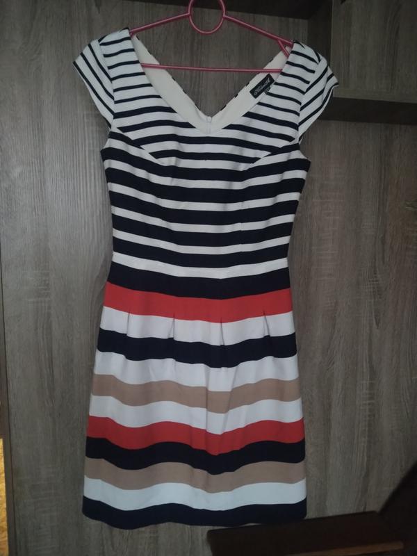 Платье Helen -A летнее женское. Размер европейский 42 - соответствует нашим 44- 46 размерам. Цвет белый, в разноцветную горизонтальную полоску разной ширины. Платье отрезное по линии талии, У- образный вырез горловины - и спереди, и сзади. Короткий рукав, по линии талии заложены складки. Сзади, по всей длине спины - застёжка "молния". Материал - мягкая ткань, слегка растягивается, состав: 52% хлопок, 46% полиэстер, 2% спандекс. Длина 90см, окружность груди 92см, окружность талии 68см, окружность бёдер 92см, длина рукава 6см. Состояние очень хорошее.