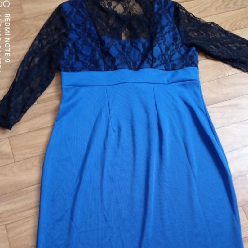 Синее платье с черными. гипюровыми вставками длина рукава 45 длина платья.103 ширина в плечах 41 объем груди 45 ширина по низу 53 ширина в талии 43 ткань стрейчи