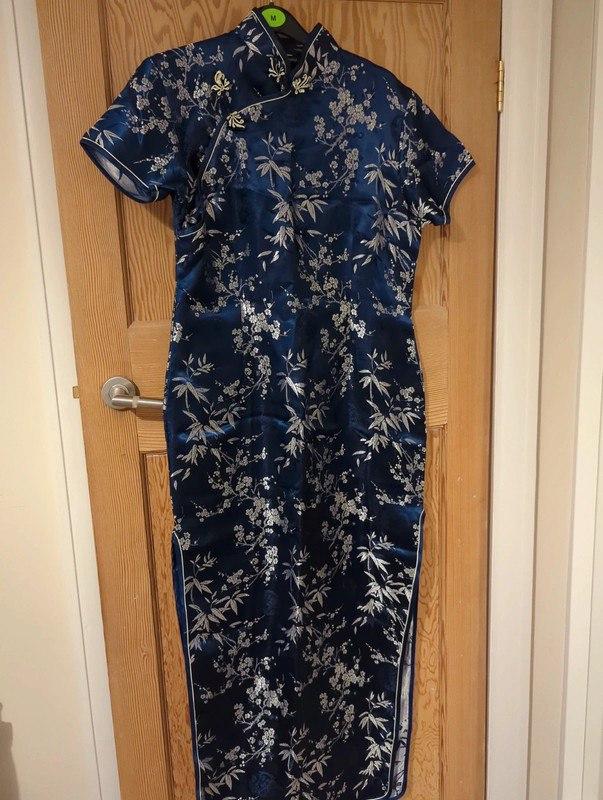 Очень красивое синее ципао на 38/40 размер. Сбоку молния, возле плеча на пуговицах. Скорее всего на фигуру «яблоко», потому что если песочные часы – в талии будут высыхать, а на бедрах ~100см вплотную.