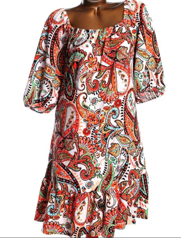 нова симпатична сукня 66-68р, указаний 26 європ. розмір, легка, симпатична, яскрава. Вона має відкриті плечі (або квадратний виріз на резинці) та короткі рукави-ліхтарики. Візерунок "Пейслі": Сукня прикрашена складним візерунком "буте" (перський огірок) у різних яскравих кольорах, включаючи помаранчевий, бірюзовий, червоний та зелений. Вільний крій (балахон або туніка) з воланом по нижньому краю створює легкий, богемний (бохо) образ. ПОГ - 85 95см, ПОС - 88 - 100см, рукав - 45см, довжина - 105см