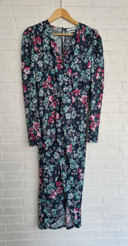 Утонченное женское платье с цветочным принтом. Состояние отличное (обедалось 1-2 раза). Прекрасный фасон, V-образный вырез, длинные рукава. Идеально на весну-осень. Дефектов нет.