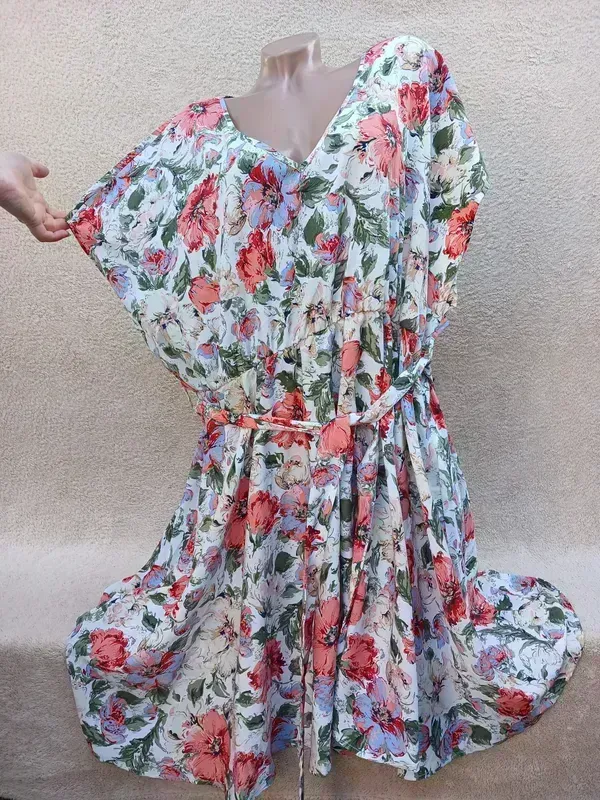 Интересное нежное тонкое платье с пояском, ткань не тянется, прохладный тонкий полиэстер, становление идеал ПО груди 74, ПО талия резинка 55-68, ПО бедра 90, длина 103 Замеры отличия половина