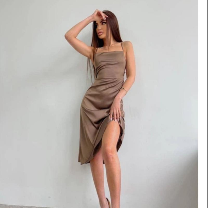 платье бежевое, миди, без бренда, атласное, с открытой спино(на завязках) то есть утягивается в талии