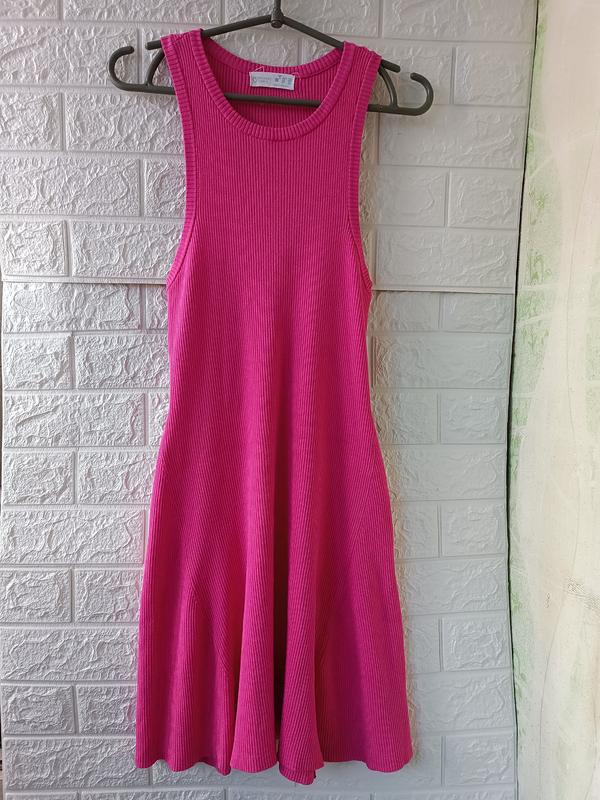 очень красивый женский сарафан розового цвета, ткань в рубчик, размер М, очень хорошо тянется, длина 86, полуобхват груди 36+ тянется до 70, 56+ тянется плечи 25.