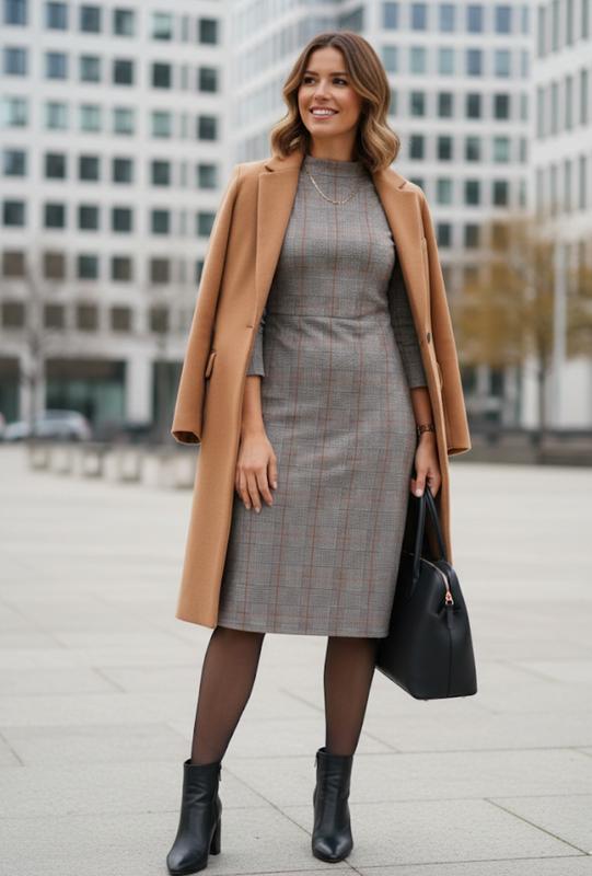 Офисное платье Esprit, размер указаемый Л. ПОГ 47см, ПОТ 43см, ПОБ 50-51см, рукав 45см, длина 99см. Это действительно классическая и универсальная вещь! Данное платье от Esprit имеет узор «гленчик» (также известно как «Принц Уэльский») с теплыми оранжевыми линиями, что придает ей сдержанный, но стильный вид. Благодаря высокому воротнику (mock neck) и рукавам 3/4, она идеально подходит для деловых встреч или осенне-весеннего сезона. Вот несколько идей, как ее можно стилизировать: 1. Элегантный офисный стиль Обувь: Лаконичные черные лоферы или туфли-лодочки цвета коньячной кожи. Верхняя одежда: структурированный черный блейзер или длинное пальто цвета кэмэл (camel). Аксессуары: Минималистичные золотые серьги и кожаная сумка-тоут. 2. Современный городской образ (Casual) Обувь: Груби черные ботинки (типа челси или Dr. Martens). Многослойность: Если холодно, под низ можно одеть тонкую черную водолазку, а сверху - короткую кожаную куртку для контраста. Аксессуары: Плотные черные колготки и сумка-мессенджер. 3. Акцент на цвете Подчеркните оранжевый: поскольку в узоре есть рыжие/оранжевые полоски, попробуйте добавить аксессуары цвета ржавчины (шарф, сумку или пояс), чтобы сделать принт более выразительным.