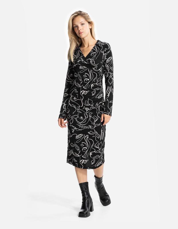 🌤️Сукня чорна в принт міді стан ідеальний, добре тягнеться, поліестер+еластин, фактурна р хл -довжина 123, рук 62 -нОг 55-60 -нОт 45-55 -нОб 59-63 ФОТО НА ТІЛІ НЕМАЄ