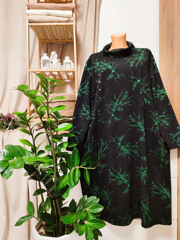 Ткань плотная, теплая, тяжелая хорошо ложится по фигуре, глубокий черный разбавленный изысканными изумрудными веточками, трапеционный крой подходит к любому типу фигуры. Длина 109, ПОГ 64, ПОБ 68, есть карманы. Указано Л и ХЛ, может быть на больше. крести подписываться, есть много хороших вещей и частое обновление товара!