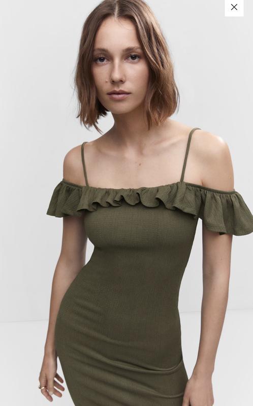 Текстурированная ткань. Приталенный крой. Длина миди. Прямой вырез горловины. Оборки. Тонкие бретельки. Без застежки. Открытая спинка.