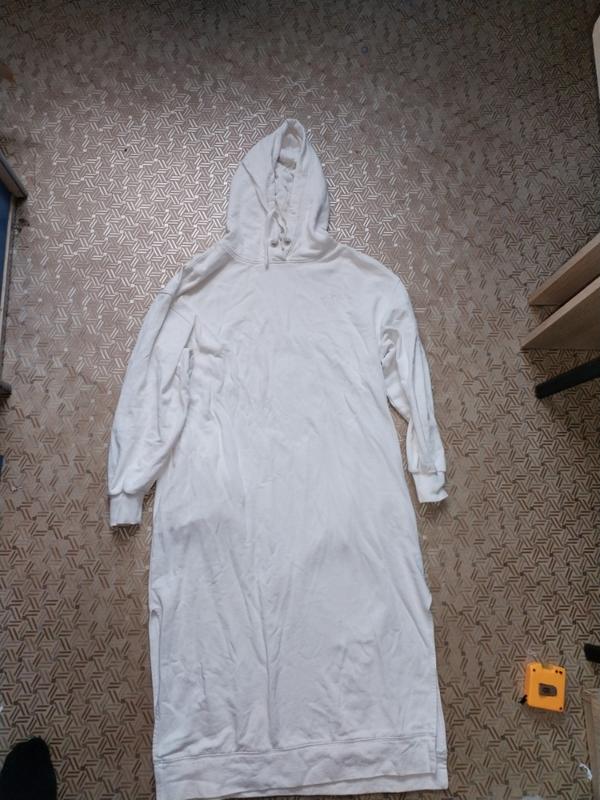 Белое платье оверсайз прямого кроя с капюшоном. На флисе имеет два кармана. И по бокам разрезы. Довжина 102 см. Рукав 49 см плечі 53 см. Груди 50 см.