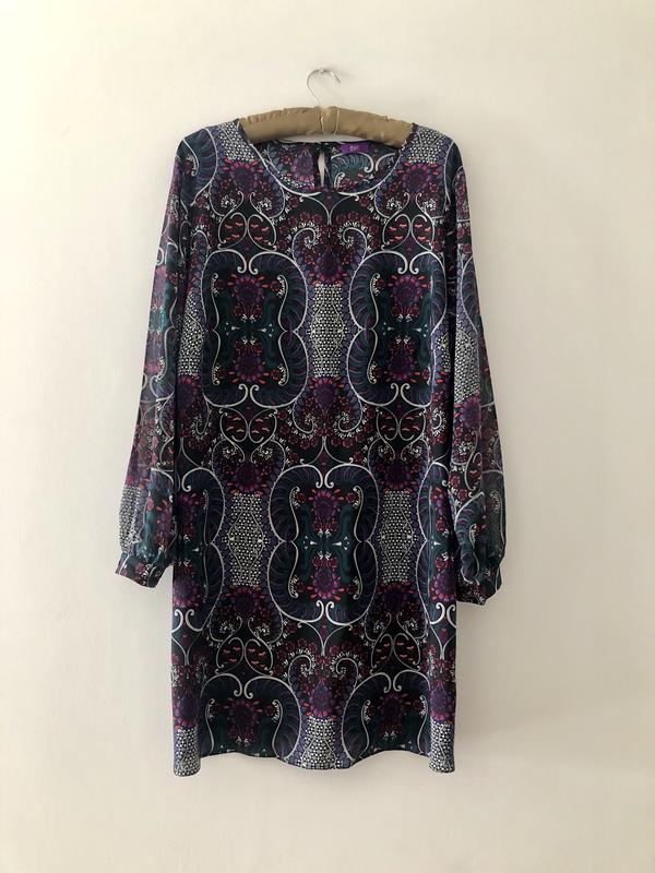 Рівний крій, красивий принт, який все приховує, тканина по силуету щільніше ніж на рукавах, але прийнятий однаковий Довжина по спинці 90, пог 64, піт 64, співаю 68, тканина тягнеться, плече 10, довжина рукава 62, ширина рукава з біцепсів є 24