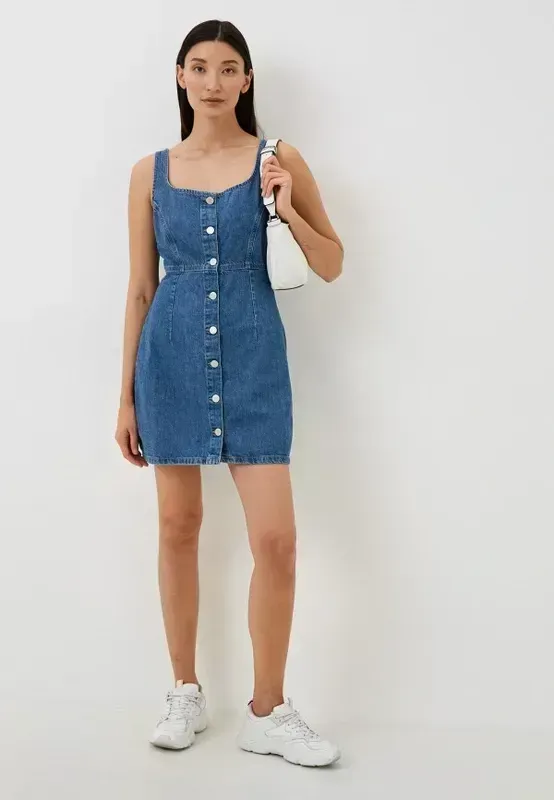 Классический джинсовый сарафан, на пуговицах, хорошо тянется, хлопок, состояние новый с биркой ПО груди 54, ПО талия 50, ПО бедра 58, длина 89 Замеры отличий половина