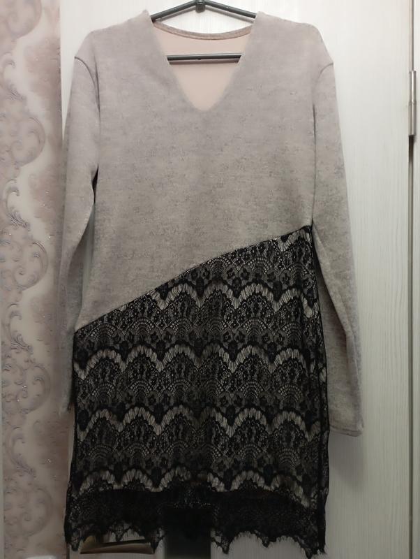 Красивое утепленное платье, украшенное красивым кружевом спереди и сзади.. материал не мнется, не кашлатится,.не нуждается в глажке.очень приятный на ощупь.слегка тянется. грудь-50 рукав-61 талия -45 длина -89 бедра-49