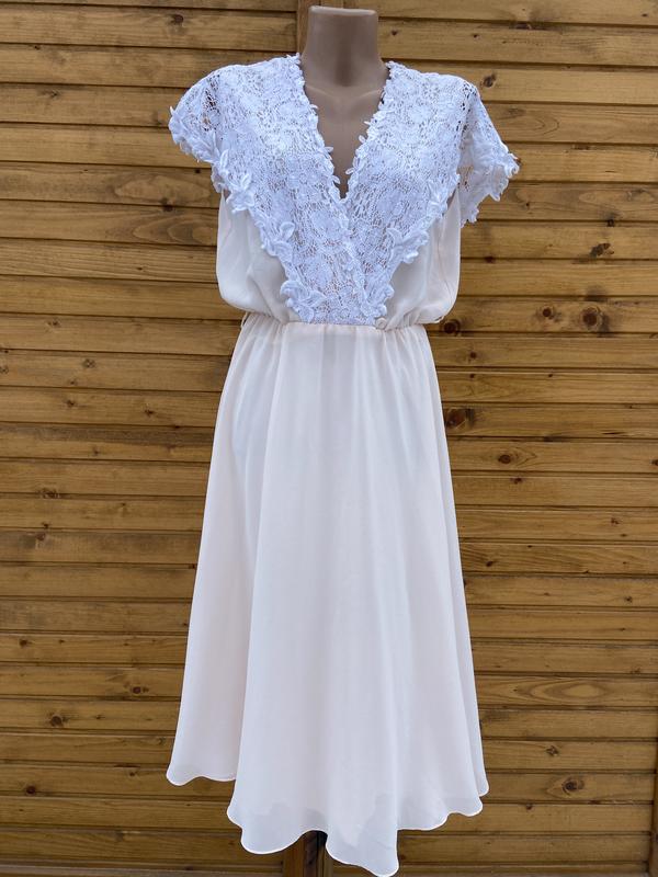 Светлое платье миди Стан идеален. Состав ткани полиэстер. Размер указан 8 Ориентировочно подойдет на размер С - М, но лучше смотрите на замеры. Замеры: От плеча до плеча - 60 см Полуобхват груди (ширина под подмышками) – 52 см Полуобхват талии (в самой узкой части талии) – 27 - 45 см Полуобхват бедер – свободно. Длина - 106 см