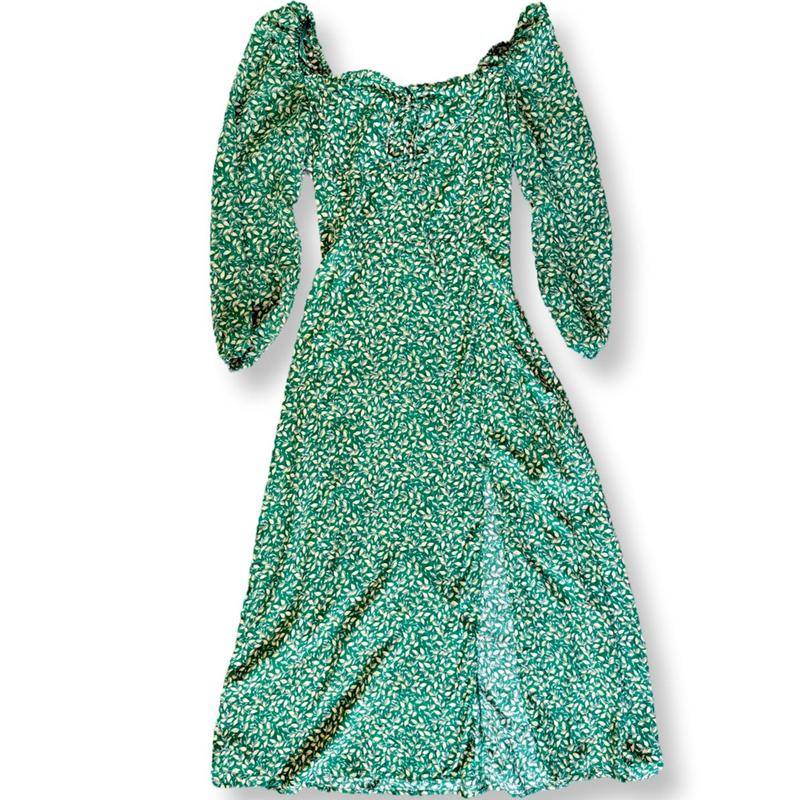 новая, но без бирки, зеленого цвета с принтом в бежевые листочки. Платье вискозное с шифоновым рукавом