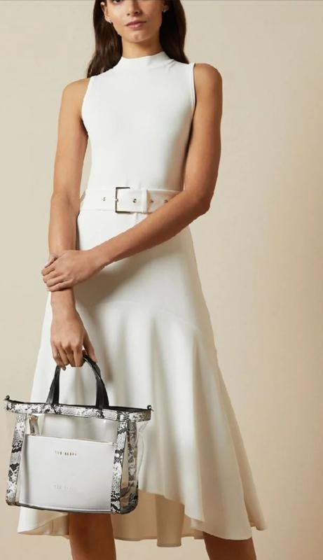 Ted Baker Corvala меди-платье молочное с поясом размер 4 Элегантная миди-платье Ted Baker Corvala в изящном молочном цвете. Особенности: • Приталенный силуэт fit-and-flare с асимметричным подолом • Высокий круглый вырез, без рукавов • Съемный пояс с пряжкой подчеркивает талию • Застежка-молния • Материал: смесь полиамида, вискозы и эластана Параметры: • Размер: 4 • Объем груди: 90 см • Обхват талии: 84 см • Обхват стегон: 106 см • Длина: спереди 109 см, сзади 127 см Состояние: новая с биркой Универсальное платье для весель, вечеринок, коктейльных мероприятий и деловых встреч. Безупречное качество британского бренда Ted Baker
