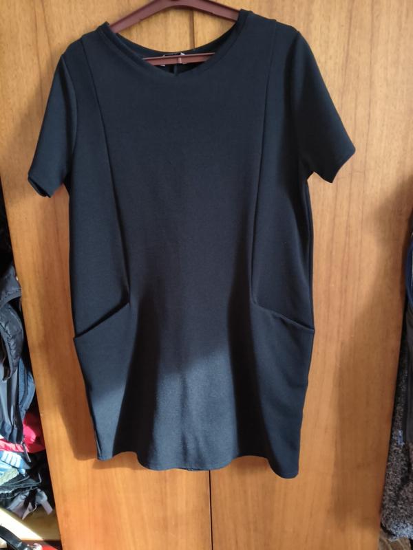 Женское черное платье прямого кроя. состав 98% полиэстер, 2% эластан. Длина 93 см, полуобъем груди 55 см, полуобъем талии 55 см.