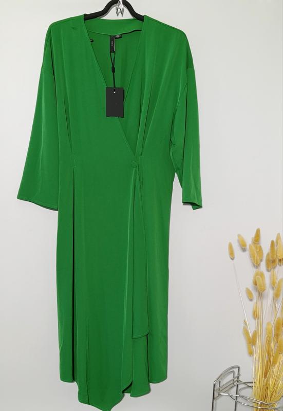 На изображении представлено ярко-зеленое платье миди с запахом. Данная модель отличается V-образным вырезом, рукавами длиной три четверти и драпировкой в области талии. грудь 100 пояс 45 бедра свободного кроя до 140 длина 110