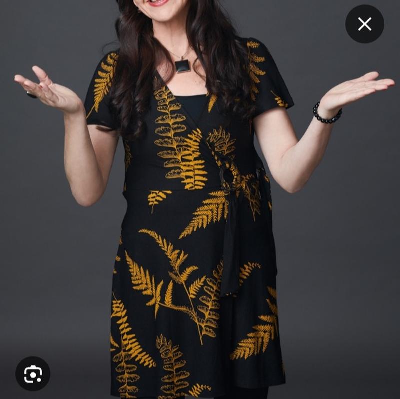 Без дефекта.Черное платье с короткими рукавами и золотистым узором папоротника.V-образный вырез.Прямый покрой на запах.Длина 93см.Пог47см.Пот40см.Поб 50см