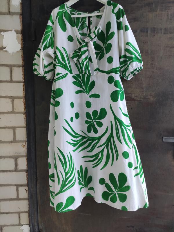 состояние новой вещи. зеленые цветы на белом фоне, катон и лен. впереди завязка, сзади на талии резинка, расклешенная кайма. размер указан хл, смотрите замеры длина 115, до талии 40, под рукавом 60, можно регулировать завязкой, талия 50 и более за счет резинки, бедра свободные, рукав реглан 45. очень красивая.