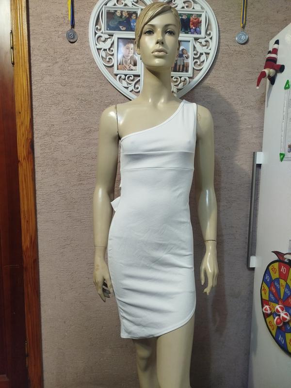 Очень классное, стильное платье белого цвета. Длина изделия по спинке от плеча (сторона которая короче) 68 см, полуобхват груди 36 см, на талии пояс. Замеры в спокойном состоянии. Ткань хорошо тянется. Модель 7391В