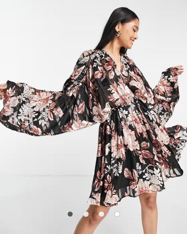 атласное мини-платье в цветочек с рукавами-блузонами и отделкой кольцами от бренда Основные характеристики изделия: Дизайн: Платье с запахом спереди и вырезом на спине, который завязывается на шнурок. Детали: Пышные рукава-блузоны, дополненные декоративными кольцами. Материал: Изделие выполнено из 100% полиэстера с атласным финишем в полоску. Принт: Крупный цветочный узор в розовых, кремовых и коричневых тонах на черном фоне. Данная модель также выпускалась в линейке ASOS Curve для размеров плюс-сайз. комку 150 пояс 130 бедра свободного кроя 160 длина 105