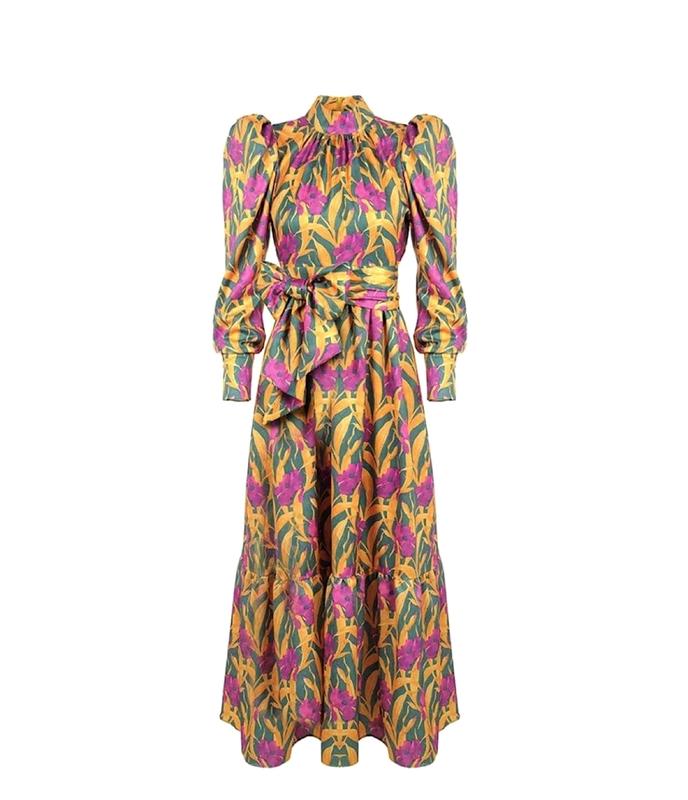 Платье с длинными объемными рукавами, на подкладке по всё площади, есть пояс, можно носить на шее как бант. 📌Есть нюанс - зацепки в зоне шеи сзади, смотрите последние фото, из-за блеска ткани и рисунка в глаза не бросаются Размер указан S длина 130 длина от плеча до талии 37 рукав 56, на невысокий рост ПОТ 32 ПОГ 37