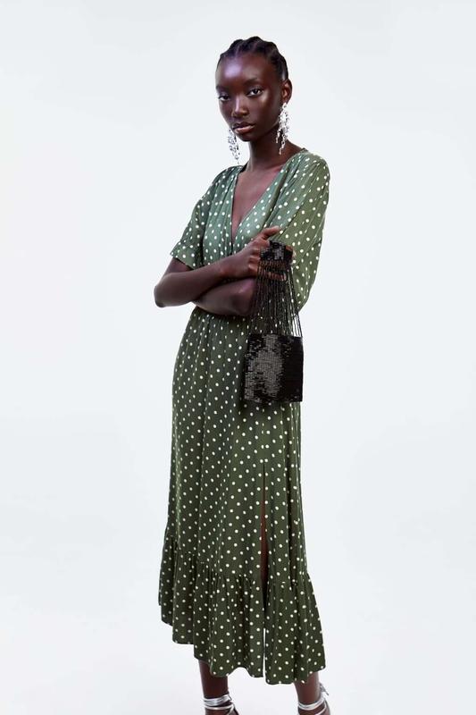 Zara 💚 платье миди слип в горошек натуральное длинное платье с разрезом в горох