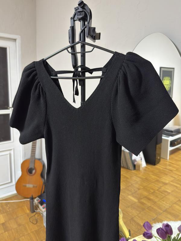 Чорна сукня ONLY в рубчик, дуже добре тягнеться. Із цікавою спинкою та рукавами. Класно сідає по фігурі та тримає форму. Приємна до тіла. Відмінна якість. Вдягалася 2 рази, в ідеальному стані Рoзмір вказаний Xs, але сукня дуже тягнеться, орієнтуйтеся на розмір S/повномірна Xs/невеличка M Заміри зроблені у спокійному стані: Довжина - 88 см Плечі - 24 см та регулюються більше/меньше зав’язками на спинці Напівоб’єм грудей - 29 см Напівоб’єм талії - 29 см Напівоб’єм стегон - 33 см Довжина по низу - 47 см Довжина рукава - 19 см Вдягнуто на зріст 156 см, розмір Xs