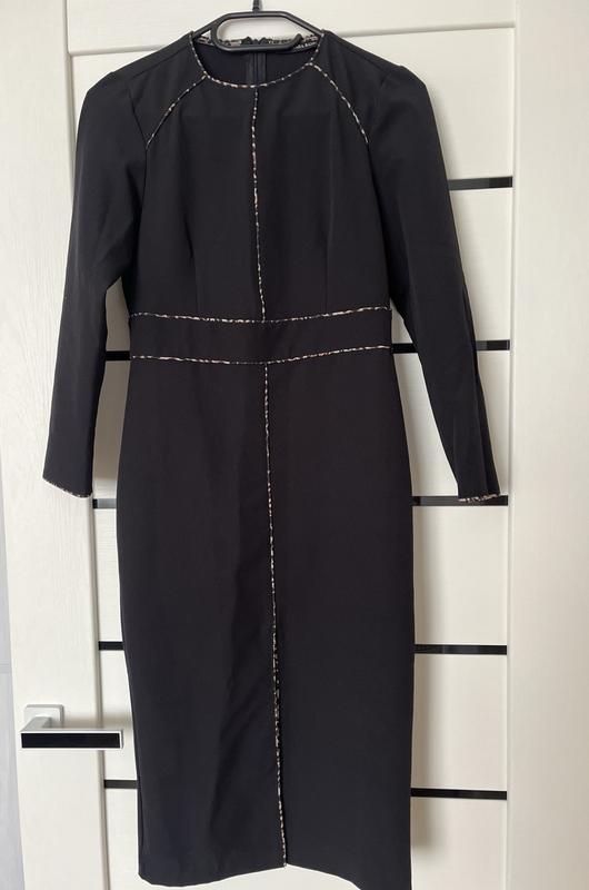 Черное платье Zara приталенного кроя, с анималистичными вставками по швам и разрезом спереди, сзади на молнии до талии. Размер на наборе S, но лучше брать на xs. Ткань хорошо тянется, но на полную S будет очень обтягивать. Замеры полуобхват: в плечах 35 в груди 42 по талии 35 бедра 43 длина 105 рукав 52 разрез 33