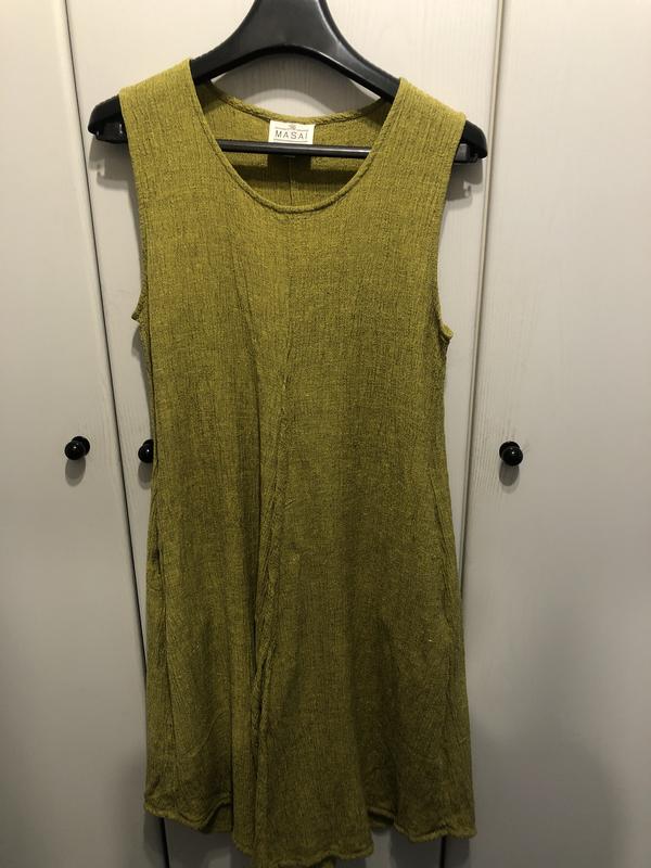 Літня сукня насиченого оливкового кольору, з карманами та розрізами спереду та ззаду.