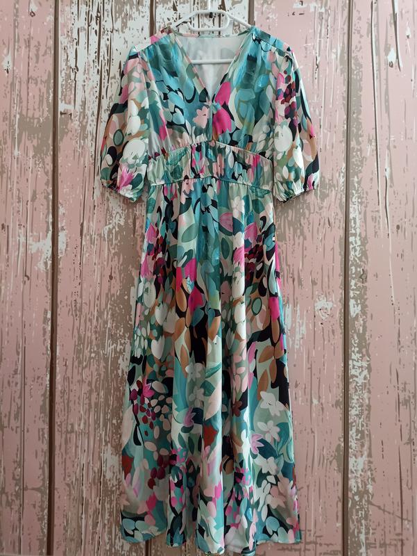 Красивое платье с весенним принтом Длина от плеча 125, рукав 35, ПОГ 50 выточек нет, ПОТ 32 тянется до 50, ПОБ 65 свободно